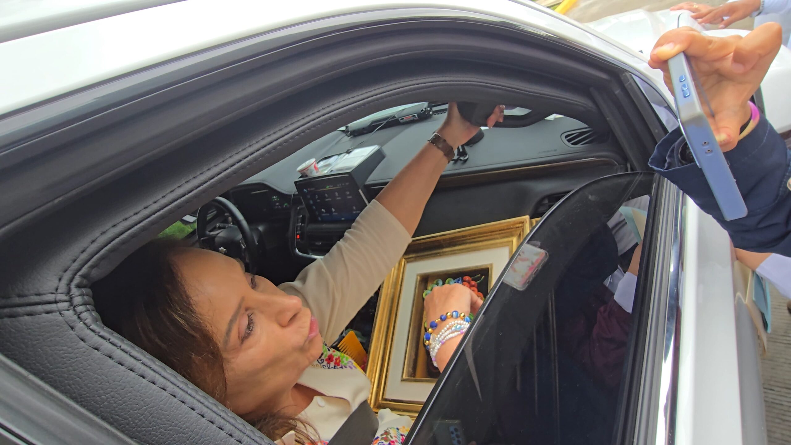 La mandataria estatal rechazó contestar más preguntas desde su camioneta y únicamente mencionó que iba a Atoyac para dar el banderazo a una carretera.
