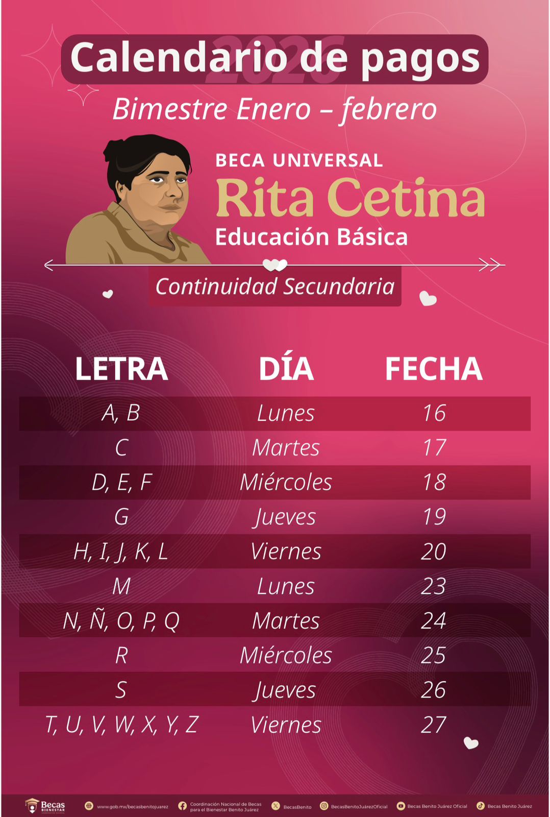 “También van a recibir sus depósitos las familias que administraron los estudiantes en educación secundaria de primer el mes de septiembre y que todavía no les entregábamos sus tarjetas y recibieron sus tarjetas en el mes de enero, estas familias van a recibir tres bimestres, van a recibir cinco mil 700 pesos que corresponde al bimestre de septiembre – octubre, noviembre – diciembre y ya se junta con enero – febrero, para quienes ingresaron al primero de secundaria septiembre el año pasado”, detalló.