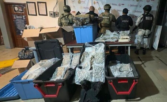 Además, las corporaciones aseguraron 29 mil 500 litros de hidrocarburo; 13 dosis de una sustancia con características del cristal, cinco contenedores de plástico, cinco bolsas, tres cajas y siete cigarrillos de hierba seca similar a la marihuana.