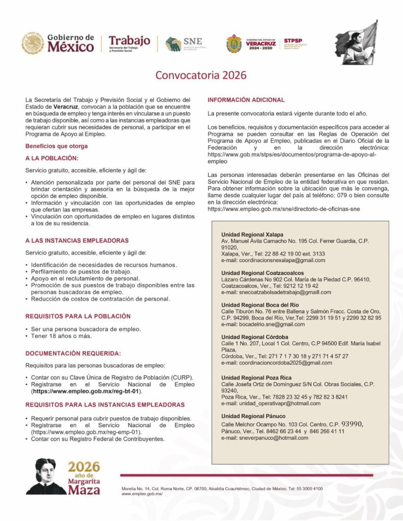Las personas interesadas podrán consultar los requisitos y procedimientos en las oficinas del Servicio Nacional de Empleo en Veracruz, así como a través de los canales oficiales de la STPSP.