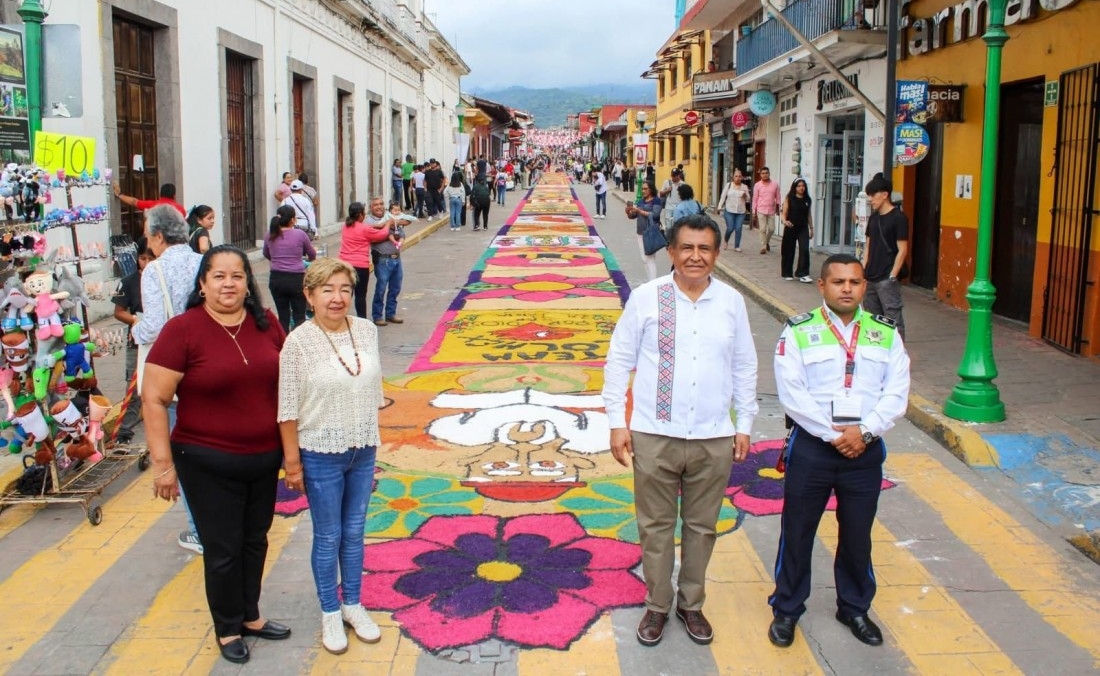 El Presidente Municipal Raymundo Andrade Rivera efectuó un recorrido para admirar los tapetes y fue acompañado de regidoras; a su paso saludó y conviviendo con las y los ciudadanos que visitaron y participaron en la elaboración de estas obras.