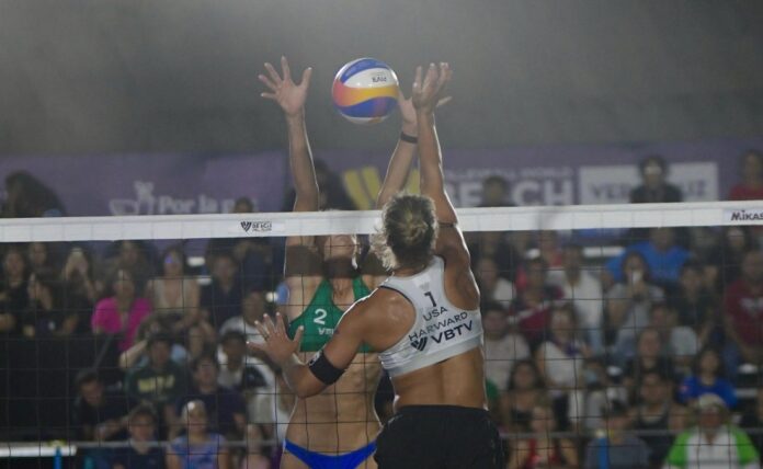 Boca del Río, Ver.- Con la asistencia de más de dos mil personas en la cancha principal instalada junto al Foro Boca, el Tour Mundial de Voleibol de Playa Challenge Veracruz vivió este viernes una jornada intensa con los partidos de clasificación femenil rumbo a los octavos de final.