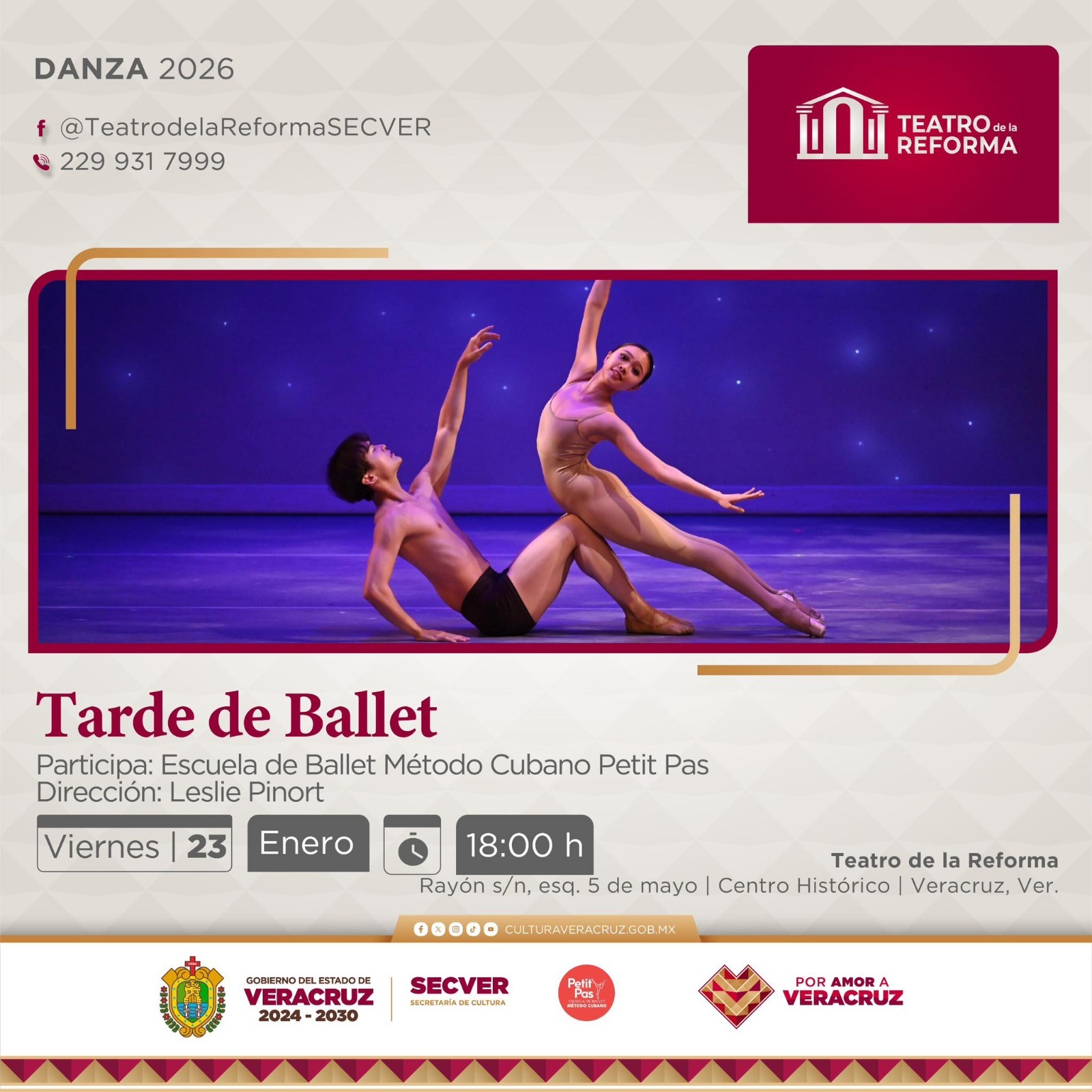 La Secretaría de Cultura de Veracruz (SECVER) invita a asistir al recital de danza Tarde de Ballet, de la Escuela de Ballet Método Cubano Petit Pas, a presentarse este viernes a las 18:00 horas, en la Sala Principal del Teatro de la Reforma, en el puerto de Veracruz. La entrada es libre.