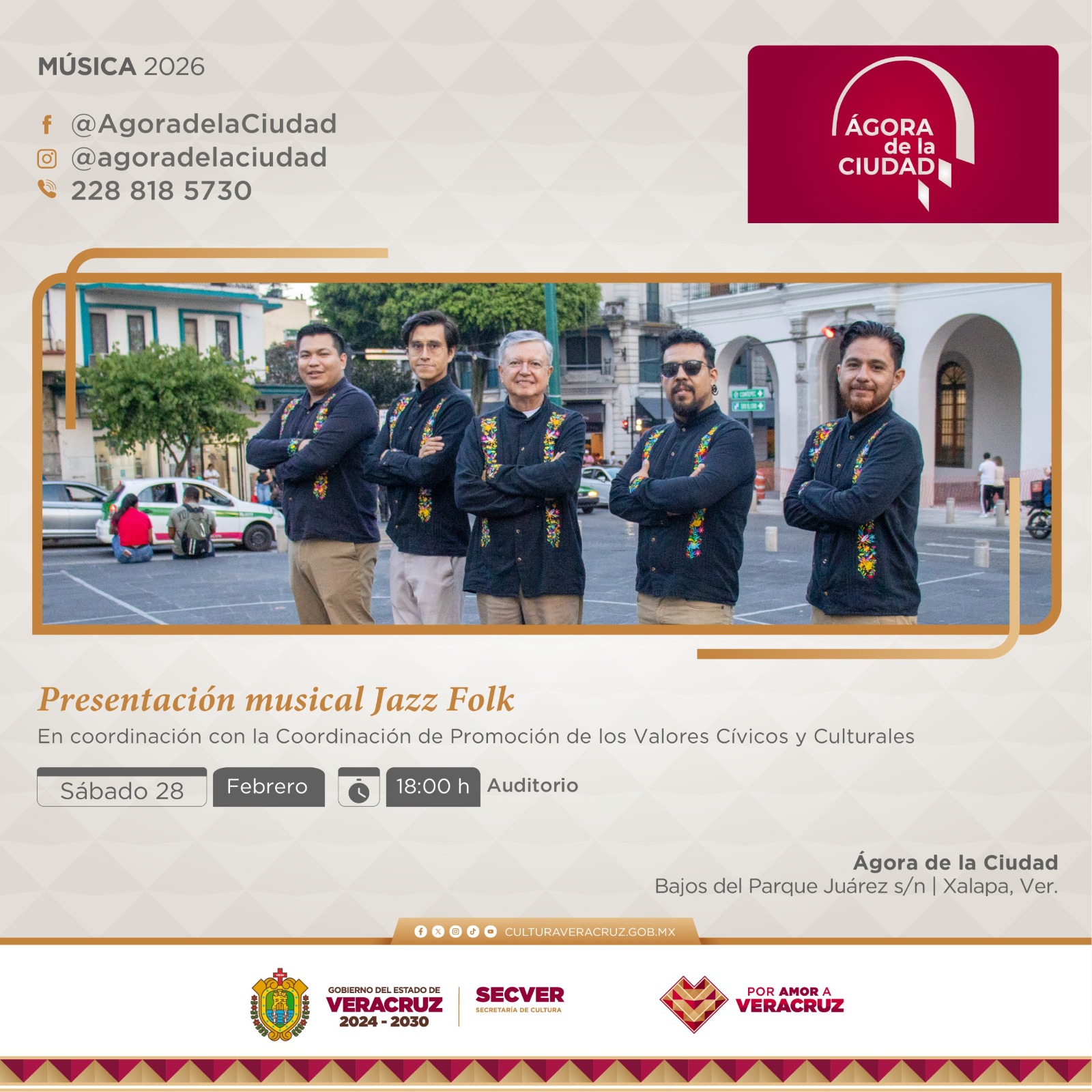 La Secretaría de Cultura de Veracruz, en colaboración con la Coordinación de Promoción de los Valores Cívicos y Culturales de la Secretaría de Gobierno, invita al concierto gratuito de la agrupación Jazz Folk, el sábado 28 a las 18:00 horas, en el Auditorio del Ágora de la Ciudad.