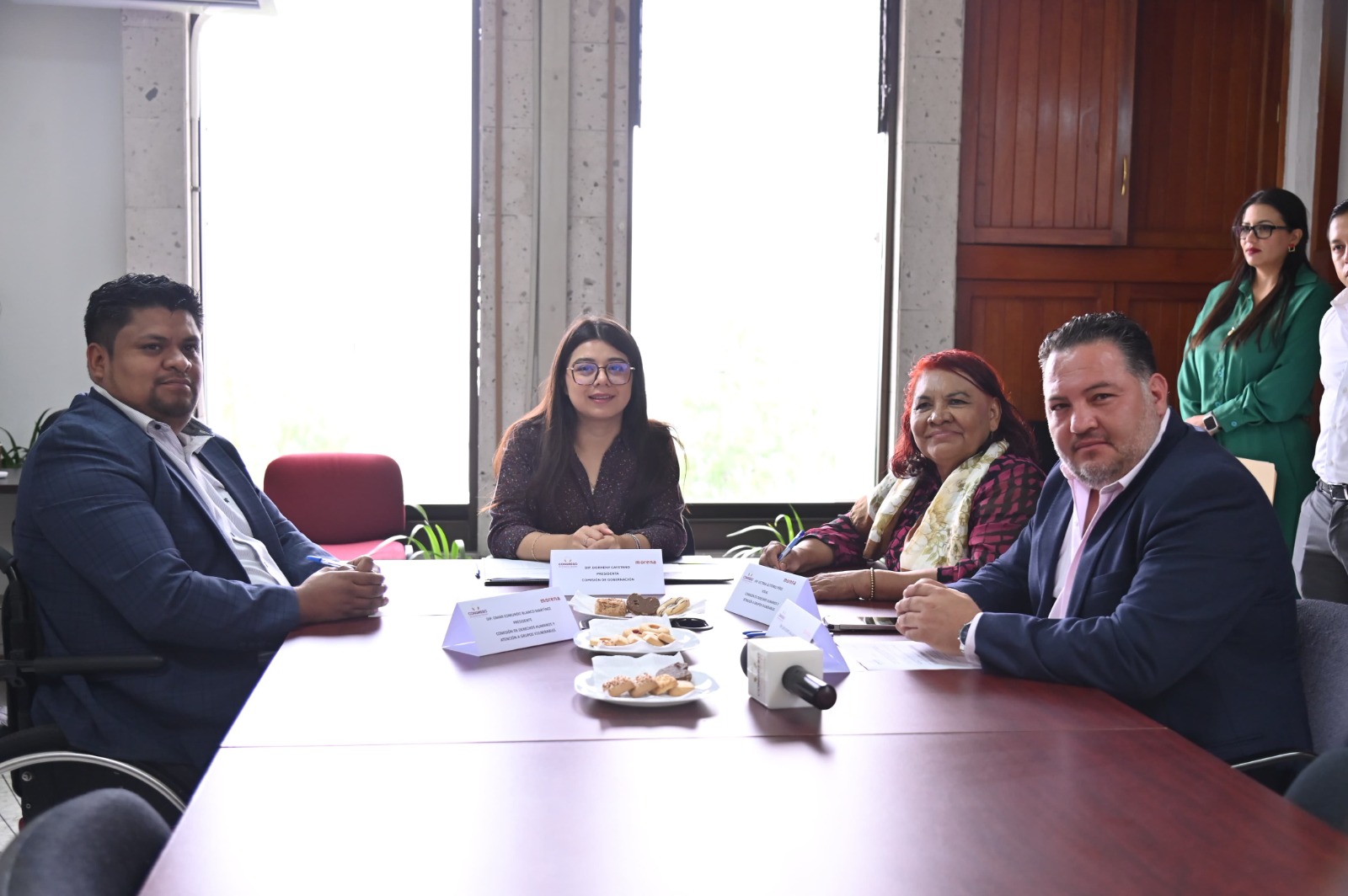 En reunión de trabajo, la diputada Dorheny García Cayetano y el legislador Luis Vicente Aguilar Castillo, presidenta y secretario de la Comisión Permanente de Gobernación, así como el diputado Omar Edmundo Blanco Martínez y la legisladora Victoria Gutiérrez Pérez, presidente y vocal de la Comisión Permanente de Derechos Humanos y Atención a Grupos Vulnerables, respectivamente, coincidieron en respaldar dicho proyecto.