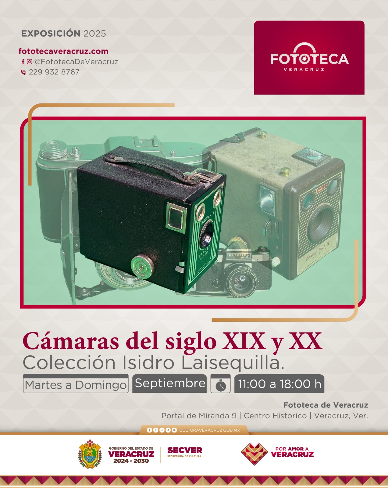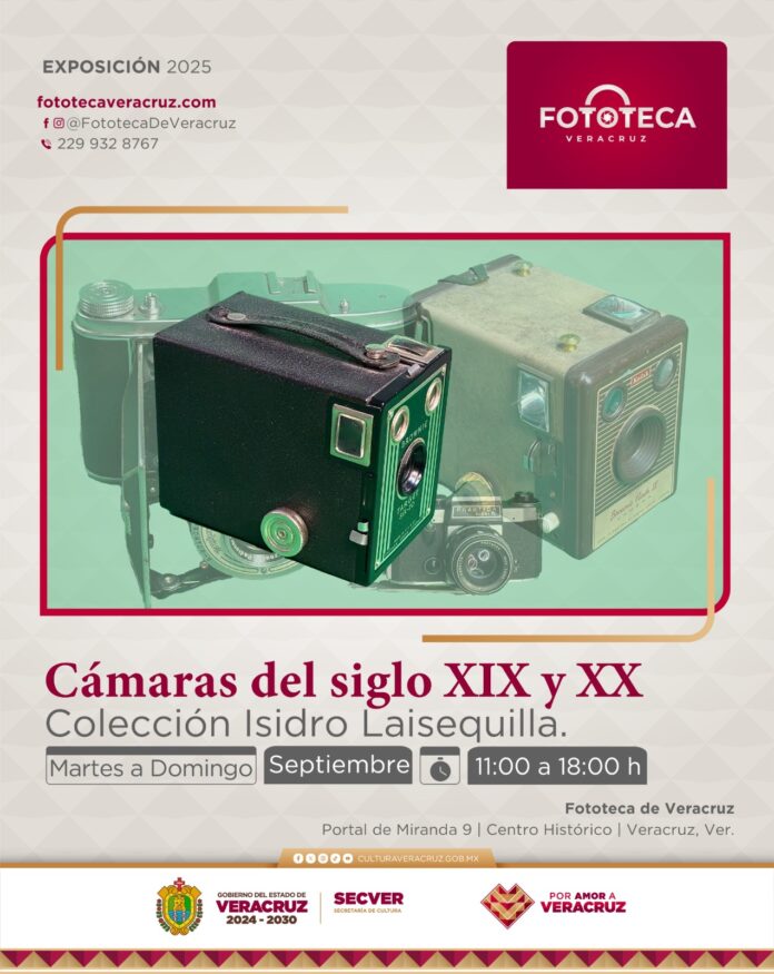 La Secretaría de Cultura de Veracruz (SECVER) invita a conocer la exposición Cámaras Fotográficas del siglo XIX y XX,  muestra de la evolución de los equipos destinados a congelar el tiempo en imágenes. Estará disponible hasta finales de octubre en la Fototeca de Veracruz. La entrada es gratuita.